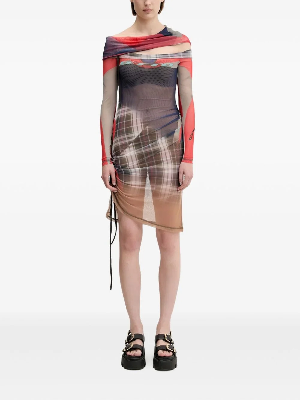 mesh-paneled asymmetical dress Highlights - Blue - Mesh paneling - Plaid pattern - Cowl neck - Asymmetrical hem - Drawstring detail Imported Composition Recycled Polyester 90%, Elastane 10% Washing instructions Read Manufacturer Guidelines