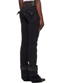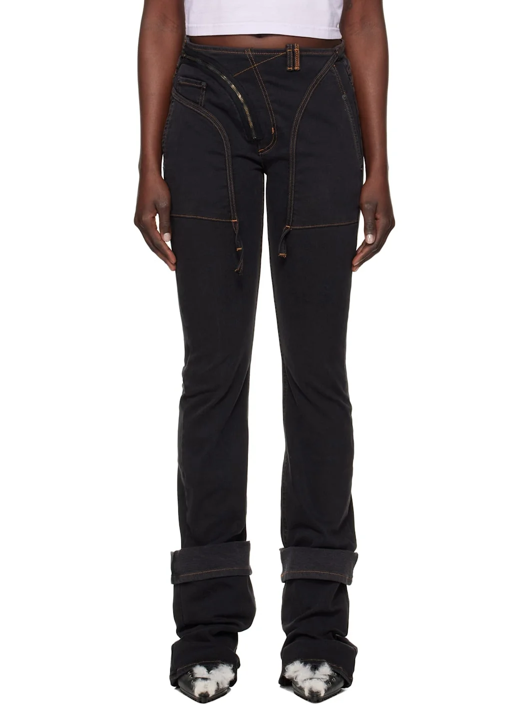 Handcrafted stretch recycled cotton-blend denim jeans. · Asymmetrical construction · Belt loops · Offset exposed zip fly · Five-pocket styling · Detachable press-stud panel at flared cuffs · Cutout and rubberized logo patch at back waistband · Logo flag at back pocket · Darts and inverted box pleats at back · Contrast stitching in tan Supplier color: Grey 51.5% recycled cotton, 26% recycled polyester, 17% viscose, 5.5% elastane. Made in Turkey 242016F069007