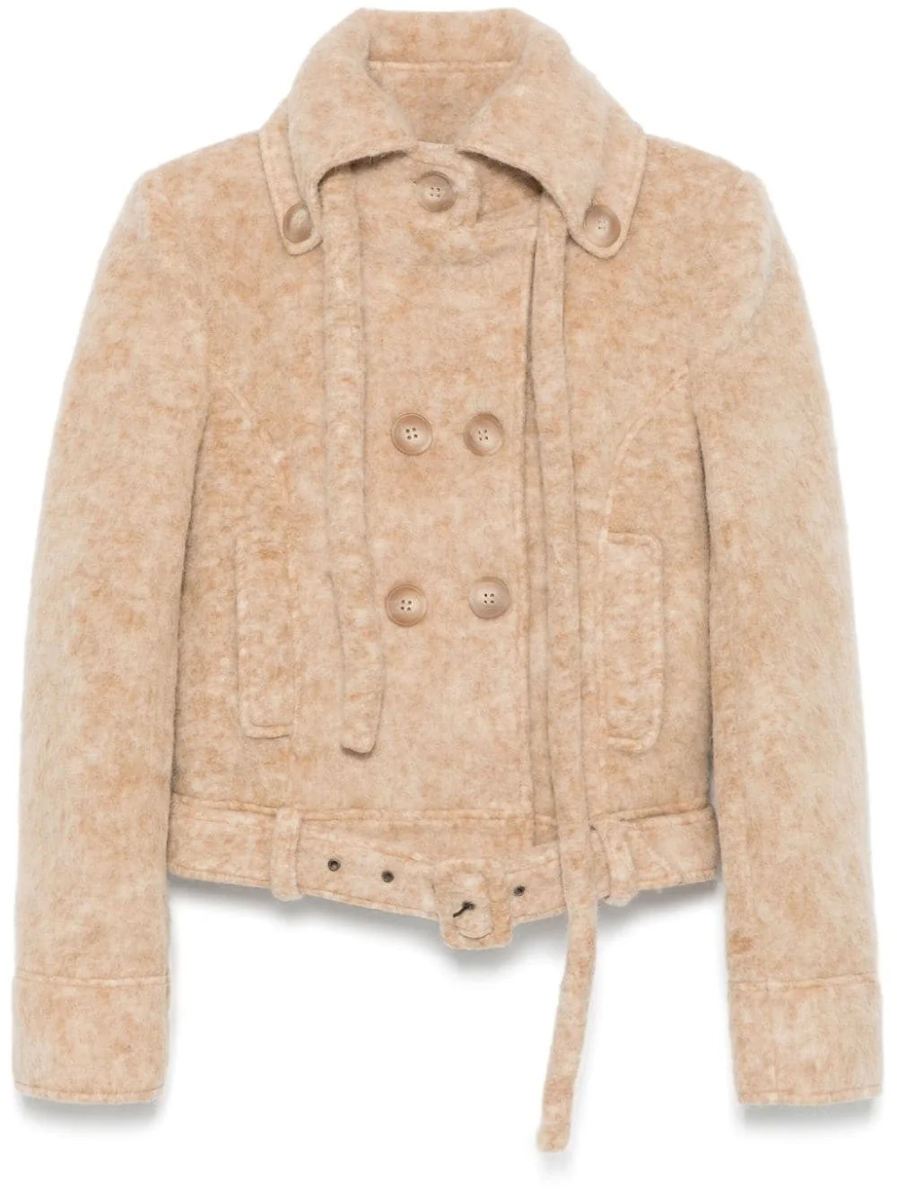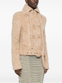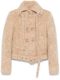 High Collar jacket Highlights - Beige - Virgin wool blend - Textured finish - Double-breasted button fastening - Button-down collar - Shoulder pads - Long sleeves - Draped detailing - Two side welt pockets - Full lining - Belted hem Imported Composition Outer: Virgin Wool 68%, Polyester 32% Lining: Polyester 100% SIZE & FIT Model measurements Height 5 ft 10 in(1.77 m) Bust/Chest 32.28 in(82 cm) Hips 35.03 in(89 cm) Waist 25.19 in(64 cm) FittingInformation Designed for a slim fit that sits just away from the body offering a close yet comfortable fit The belt offers adjustability for fitted preferences Made from a midweight non-stretch fabric