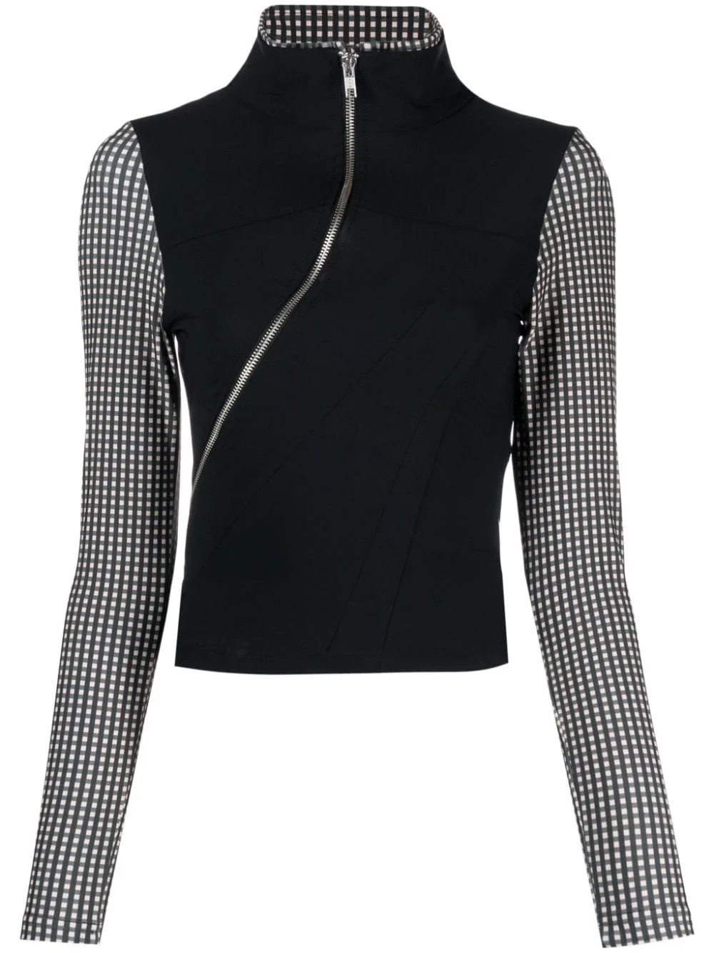 layered checked high-neck top Highlights - Black/white - Stretch-design - Layered design - Contrasting panel detail - Check pattern - High neck - Off-centre front zip fastening - Long sleeves - Straight hem Imported Composition Polyester 43%, Polyamide 36%, Spandex/Elastane 21% SIZE & FIT Model measurements Height 5 ft 10 in(1.77 m) Bust/Chest 34.64 in(88 cm) Hips 35.43 in(90 cm) Waist 24.8 in(63 cm) FittingInformation Designed for a close fit throughout Made from a midweight stretch fabric, this piece offers elasticity and flexibility when worn This piece fits true to size – take your usual size Washing instructions Dry Clean Only