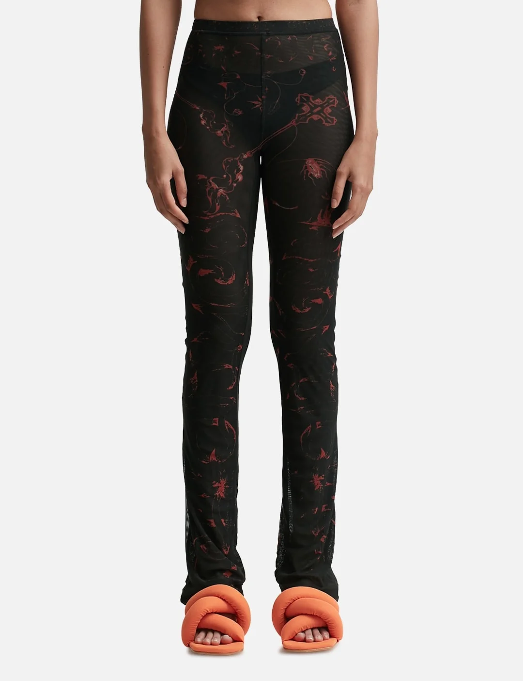 - Ottolinger - Mesh Pants - Fitted - Graphic prints throughout - Sheer mesh construction - Elasticated waist - Color: Skribbl Red - Material: 90% Recycled Polyester, 10% Elastane - See more Pants and Clothing SIZING - Model wears size XS - Model measures: Height 177cm, Chest 29”/74cm, Waist 23.6”/60cm,Hip 34.6’’/88cm