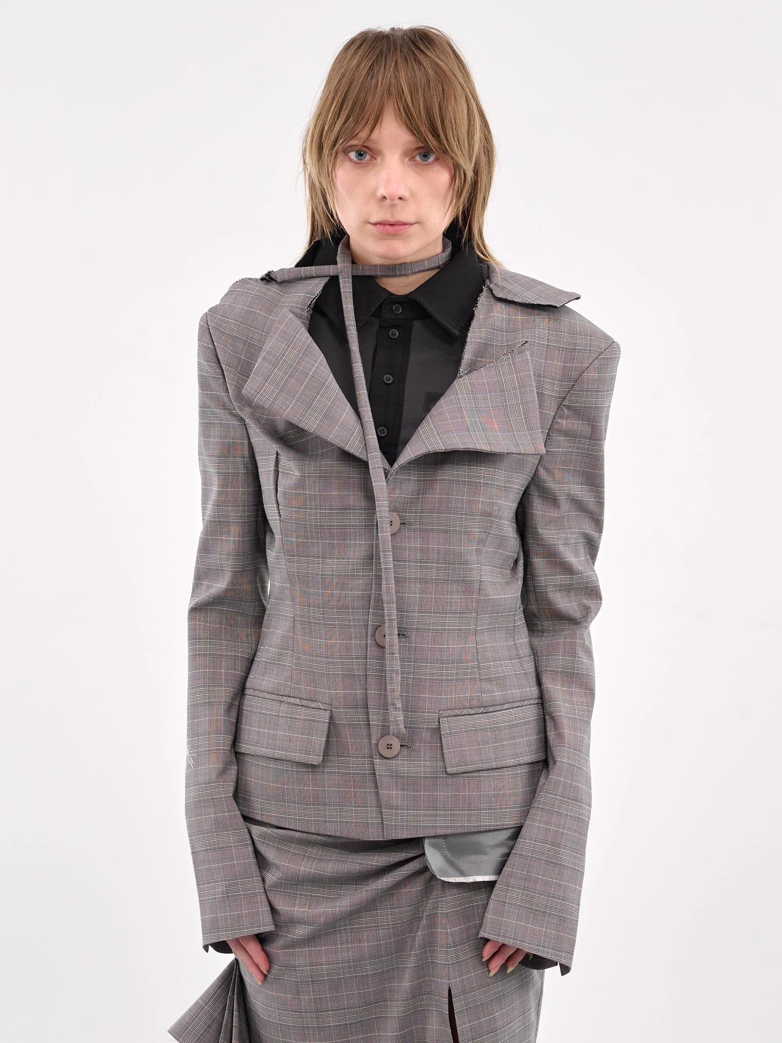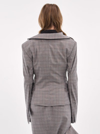 OTTOLINGER blazer in grey, poly-wool blend, paneled construction, plaid pattern, deconstructed detailing throughout, wrap-around neck, deconstructed notched lapel, off-shoulder style, long sleeves, cuff vents, front button closure, side welted flap pockets, back vents, straight hem, tailored fit. Made in Greece 54% Polyester 44% Wool 2% Elastane French Sizing Model is 5'5" wearing size 36. Bust: 32" Waist: 25" Hips: 33"