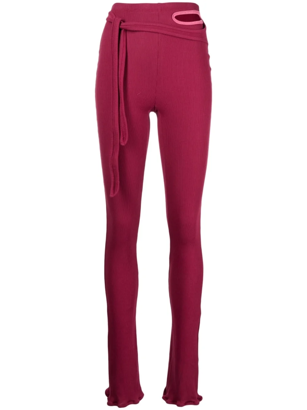 Otto Lounge cut-out trousers A signature Ottolinger silhouette, these slim-fitting trousers are ribbed with a hint of stretch for added comfort. A cut-out at the waist is complemented by an attached tie belt. Imported Composition Body: Recycled Polyester 97%, Elastane 3% SIZE & FIT Model measurements Height 5 ft 10 in(1.77 m) Bust/Chest 31.49 in(80 cm) Hips 35.43 in(90 cm) Waist 25.19 in(64 cm) FittingInformation This piece fits true to size. We recommend you get your regular size Cut for a close fit Made with a mid-weight fabric Washing instructions Machine Wash