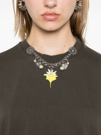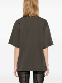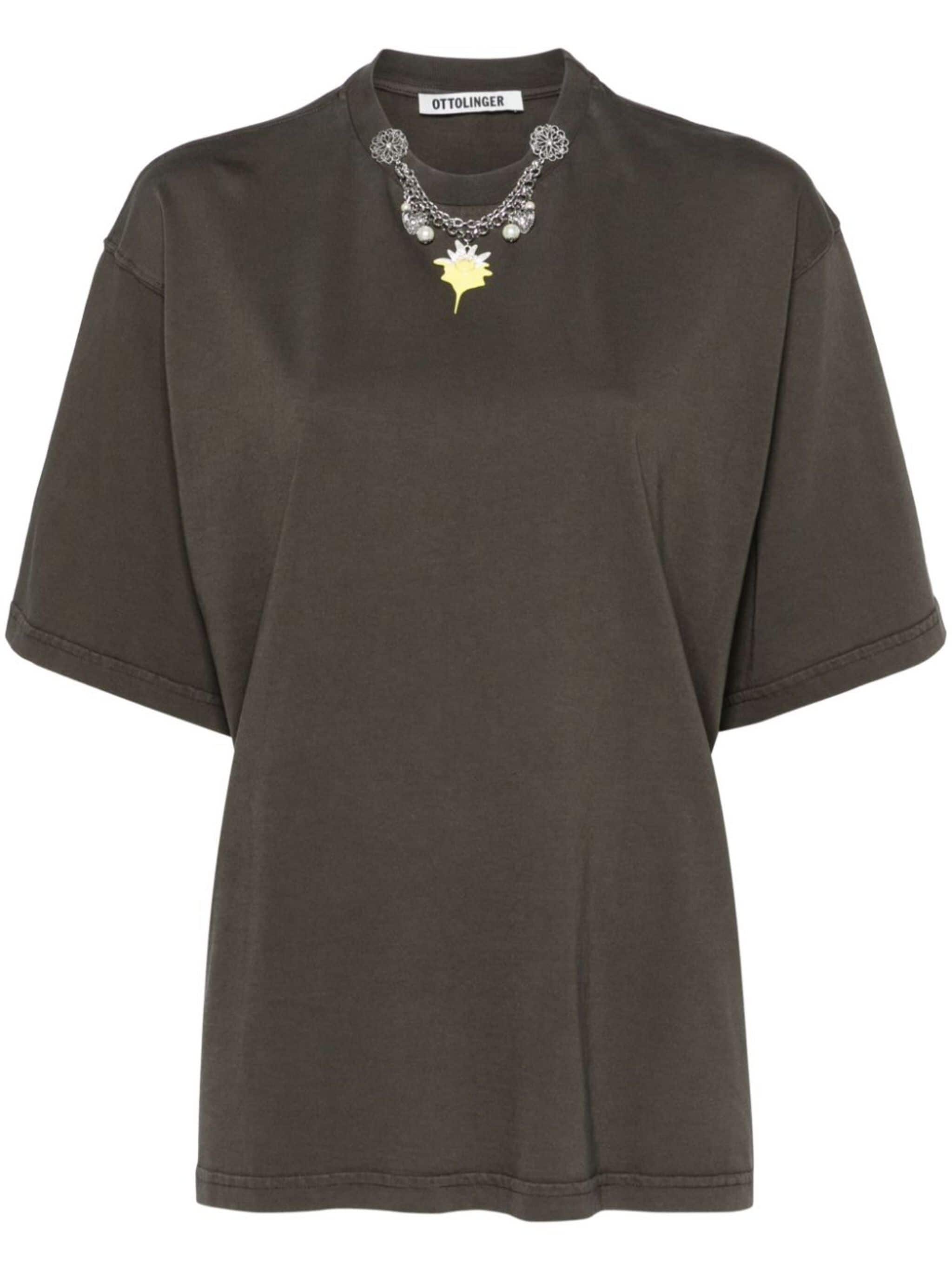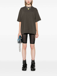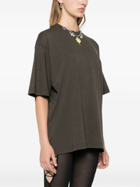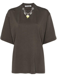 cedar brown organic cotton jersey texture ribbed crew neck short sleeves charm detail straight hem This item is made from at least 50% organic materials. Learn more about what makes a product Conscious on our Conscious Criteria page Size & Fit Model Measurements: Height: 1.75 m Bust/Chest: 78.0 cm Hips: 88.0 cm Waist: 59.0 cm Model wears size XS Fabric and Care Designer Style ID: 1150102521 Designer Colour: DARK BROWN WASH Composition: Organic cotton 100% Washing instructions: Machine Wash Made in Greece