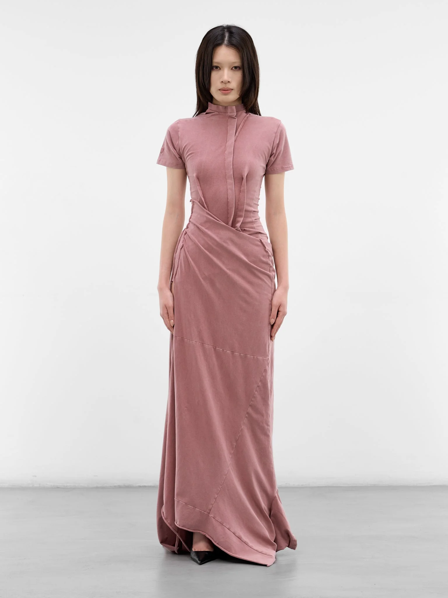Red organic cotton dress with faded finish and all-over deconstructed detailing. Featuring: • Slim fit • Maxi length with asymmetric hem • Cotton construction with faded finish • Deconstructed design with all-over deconstructed detailing • Raw hems and pleating throughout • High neck and short sleeves • Slim tailoring at waist and flaring below hips • Armholes at legs • 97% Organic Cotton 3% Elastane • Standard sizing Model is 5'7" wearing size S. Bust: 30" Waist: 24" Hips: 35"