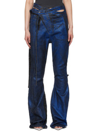 Stretch denim jeans. Faded metallic coating throughout. · Asymmetrical construction · Belt loops · Extended trim and cutouts at waistband · Five-pocket styling · Offset button fly · Rubberized logo patch at back waistband · Logo flag at back pocket · Self tie straps at back legs · Logo-engraved gunmetal-tone hardware Available exclusively at SSENSE. Supplier color: Black/Blue metallic 98% cotton, 2% elastane. Made in Turkey 251016F069001