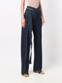 tie-fastening straight-leg jeans navy-blue recycled cotton-blend asymmetric design front tie fastening straight leg two diagonal pockets to the sides Imported Composition Cotton 63%, Recycled Cotton 30%, Recycled Polyester 6%, Spandex/Elastane 1% SIZE & FIT Model measurements Height 5 ft 10 in(1.78 m) Bust/Chest 33.46 in(85 cm) Hips 36.22 in(92 cm) Waist 23.22 in(59 cm) FittingInformation This piece fits true to size. We recommend you get your regular size Designed to be fitted at the waist and hips, loose over the leg Made with a mid-weight stretch fabric