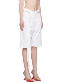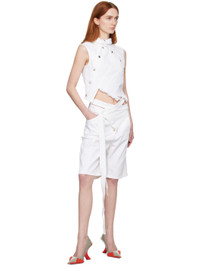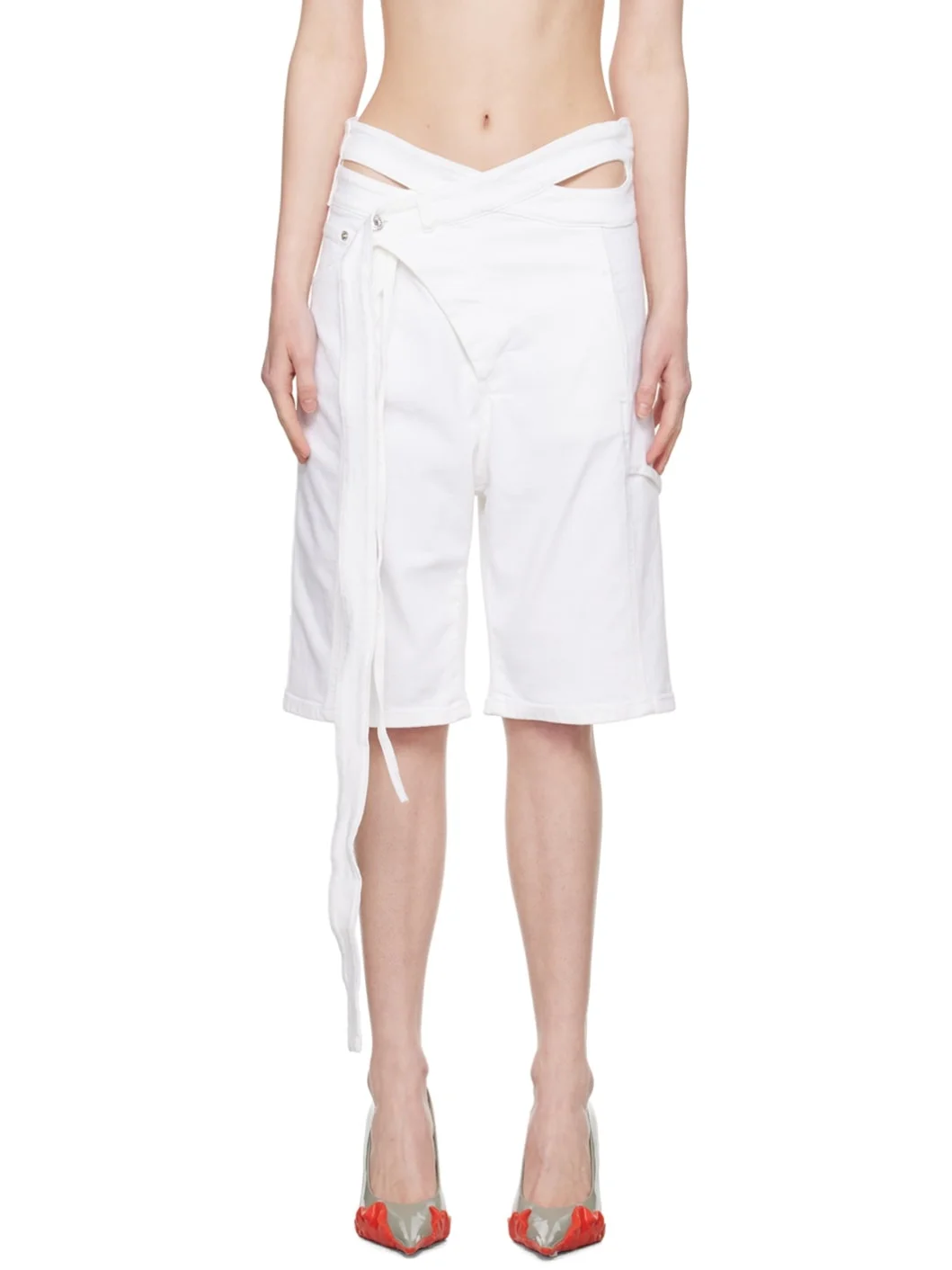 ISKO RECALL™ stretch denim shorts. · Asymmetrical construction · Belt loops, cutouts, and strap at modified waistband · Offset button-fly · Five-pocket styling Supplier color: White
