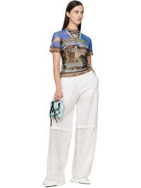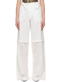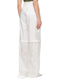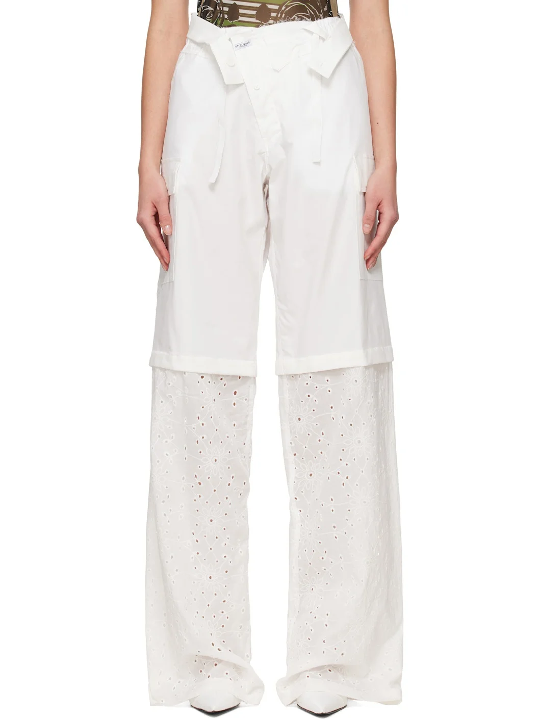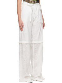 Stretch polyester-blend twill and broderie anglaise cargo pants. Raw edges and embroidered floral pattern throughout. · Paneled construction · Drawstring at elasticized waistband · Trim with button fastening at waistband · Four-pocket styling · Offset zip fly · Logo patch at front · Drawstring at knees and cuffs · Cargo pocket at outseams · Logo flag at back Supplier color: White 58% polyester, 40% cotton, 2% elastane. Made in Greece 251016F087005