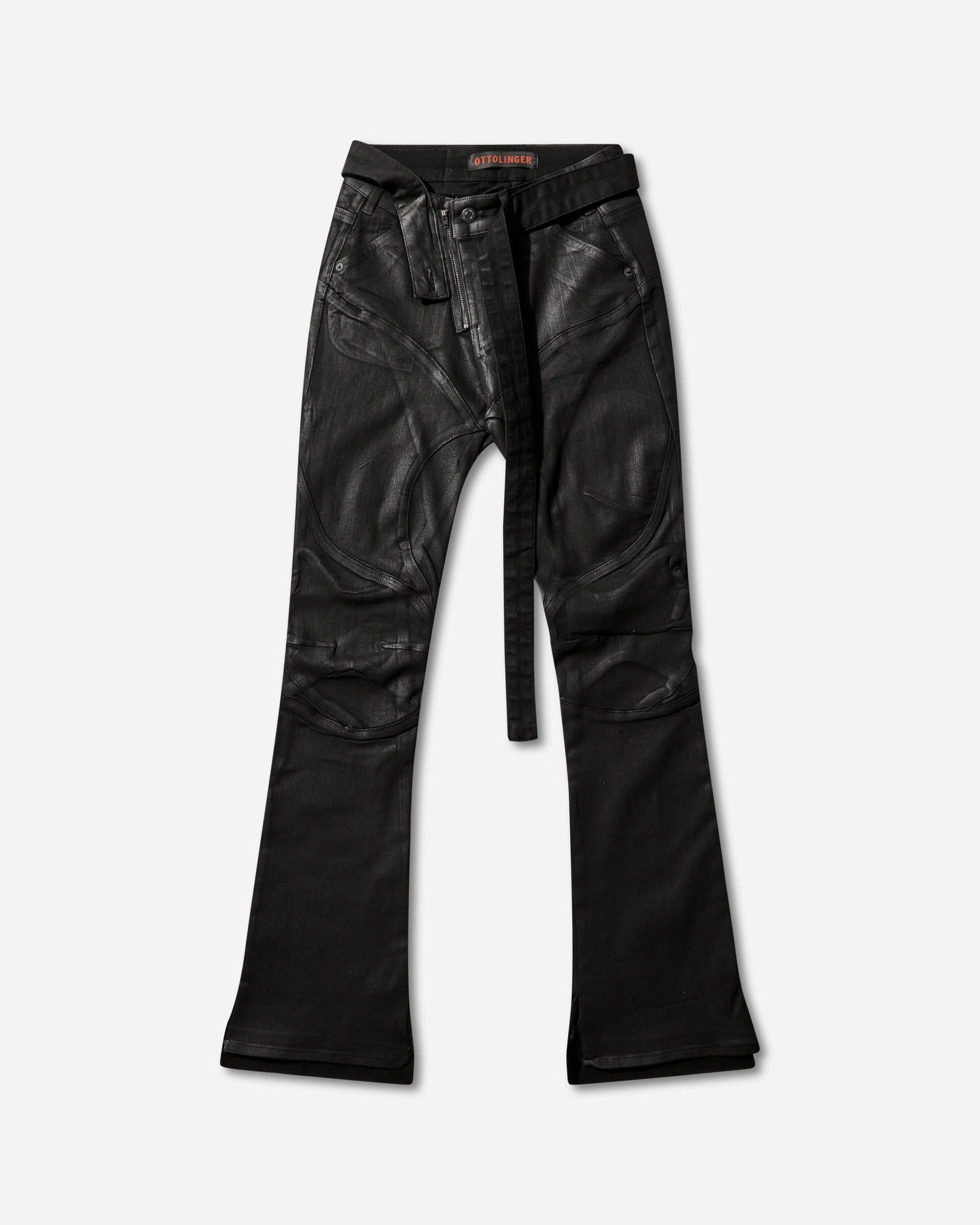 Ottolinger Glazed Mulitline Jeans Black Glazed finish denim pants with button-up closure with exaggerated belt strap. Flared fit. - 80% Cotton, 17% Polyester, 3% Elastane - Flared Fit - Glazed Finish - Asymmetrical Wrap Construction - Button Closure - Zip-Fly - Two Side Pockets - Strap Detail - Two Back Pockets - Style Code: 117-203717-01 BLK