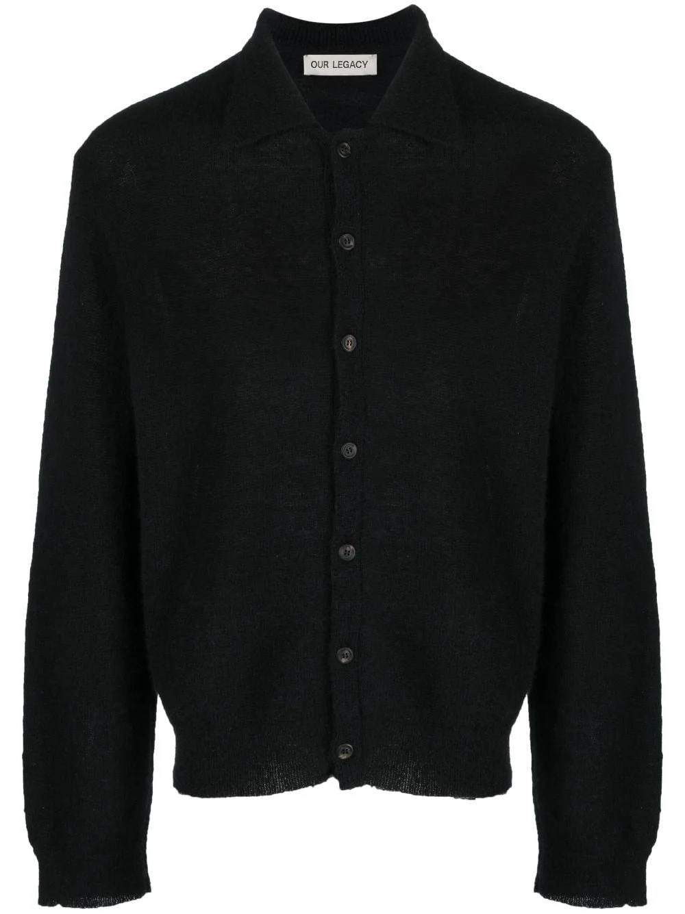 alpaca-blend knitted cardigan Highlights - Black - Alpaca wool-blend - Knitted construction - Pointed flat collar - Front button fastening - Long sleeves - Straight hem Imported Composition Alpaca 55%, Polyamide 30%, Wool 15% SIZE & FIT Model measurements Height 6 ft 2 in(1.87 m) Bust/Chest 36.41 in(92.5 cm) Hips 35.43 in(90 cm) Waist 29.52 in(75 cm) Measurement CHEST 48.03 in(122 cm) Washing instructions Hand Wash
