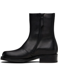 Ankle-high aniline-dyed buffed calfskin boots. · Zip closure at inner side · Logo hardware at collar · Leather lining · Kilger leather block heel and midsole · Treaded Vibram® sole · Heel: H1.5" Supplier color: Black Upper: calfskin. Sole: rubber. Made in Portugal 261803F113005