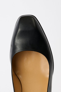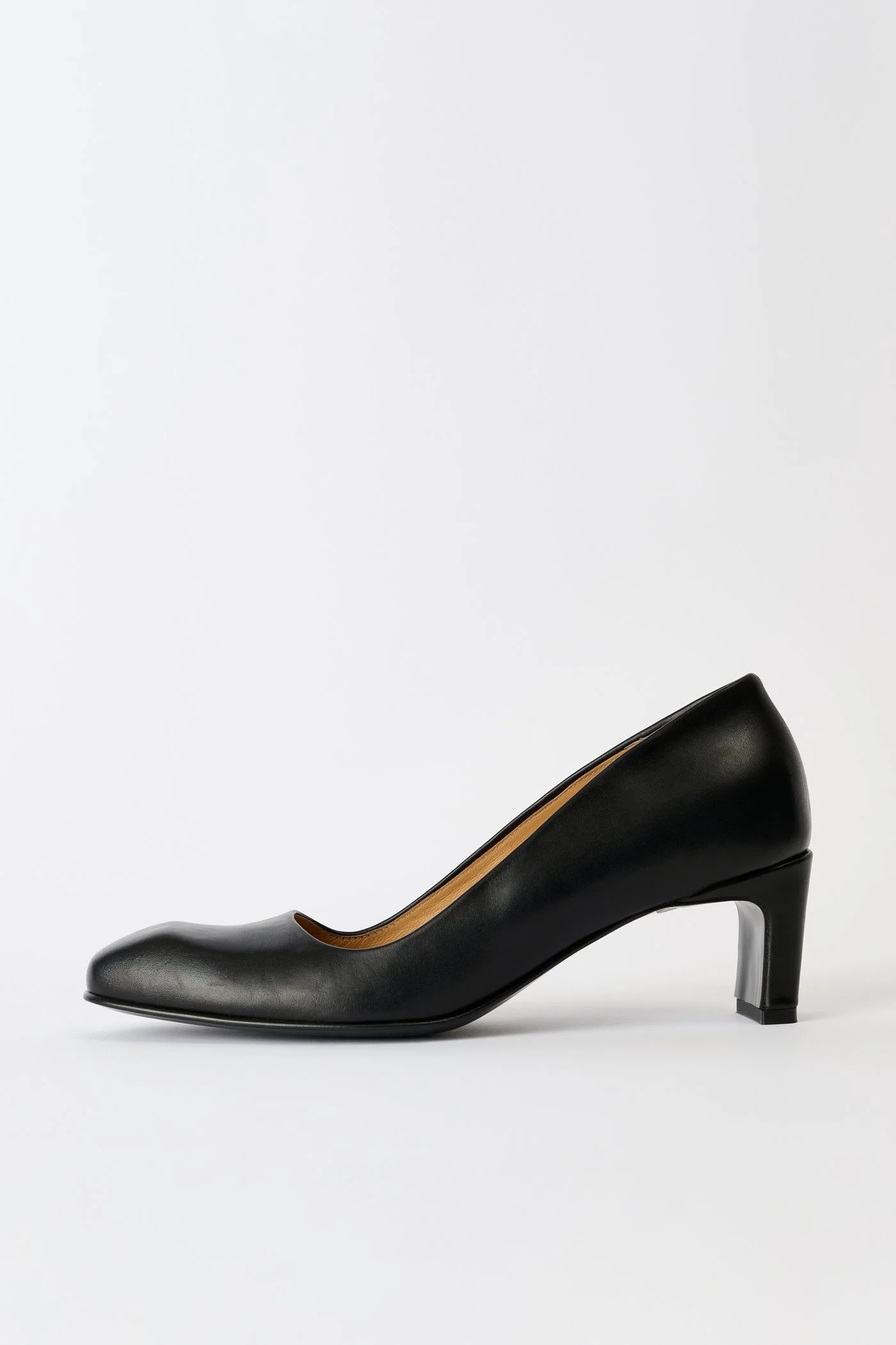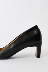 Details · Italian leather · Vegetable tanned · 5 cm block heel · Angular toe shape with beak-like front · Thin leather sole · Leather covered block heel · Fitted last with pointier toe · Wide opening design · A4257PBT Description Our Karasu Pump in Black Tensile Cattle Hide. Produced in Italian vegetable-tanned leather with a rubbery touch and soft shine, the women's Karasu Pump features a fitted last with a distinctive angular, beak-like toe shape that creates the signature Karasu family silhouette. The pump stands on a thin leather sole with a 5cm thin leather-covered block heel that widens towards the front for a refined, minimalist aesthetic. This product is crafted from carefully sourced leather. As a natural material, leather carries subtle traces of the animal's life. These natural imperfections bring a unique character to each product, expressing an original and authentic look. The product shall be shaped by its wearer and naturally distress over time to complete the design process.