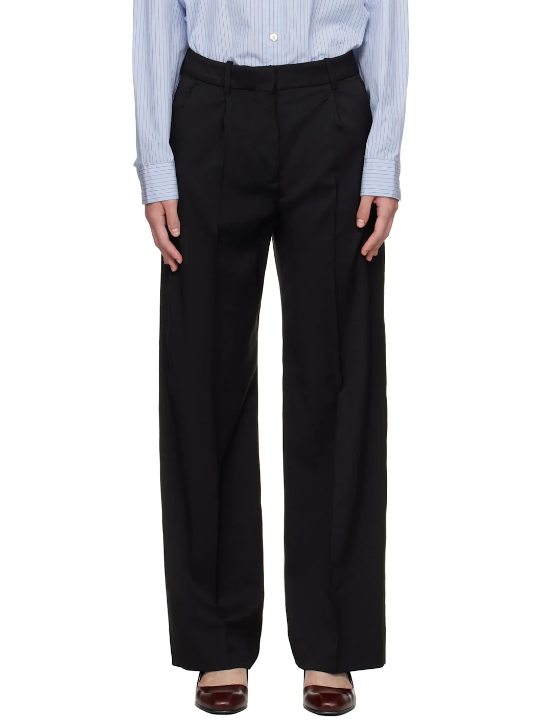 Virgin wool twill trousers. · Bootcut · Belt loops · Three-pocket styling · Zip fly · Pleats at front · Creased legs Supplier color: Black worsted wool 100% virgin wool. Made in Portugal 261803F087006