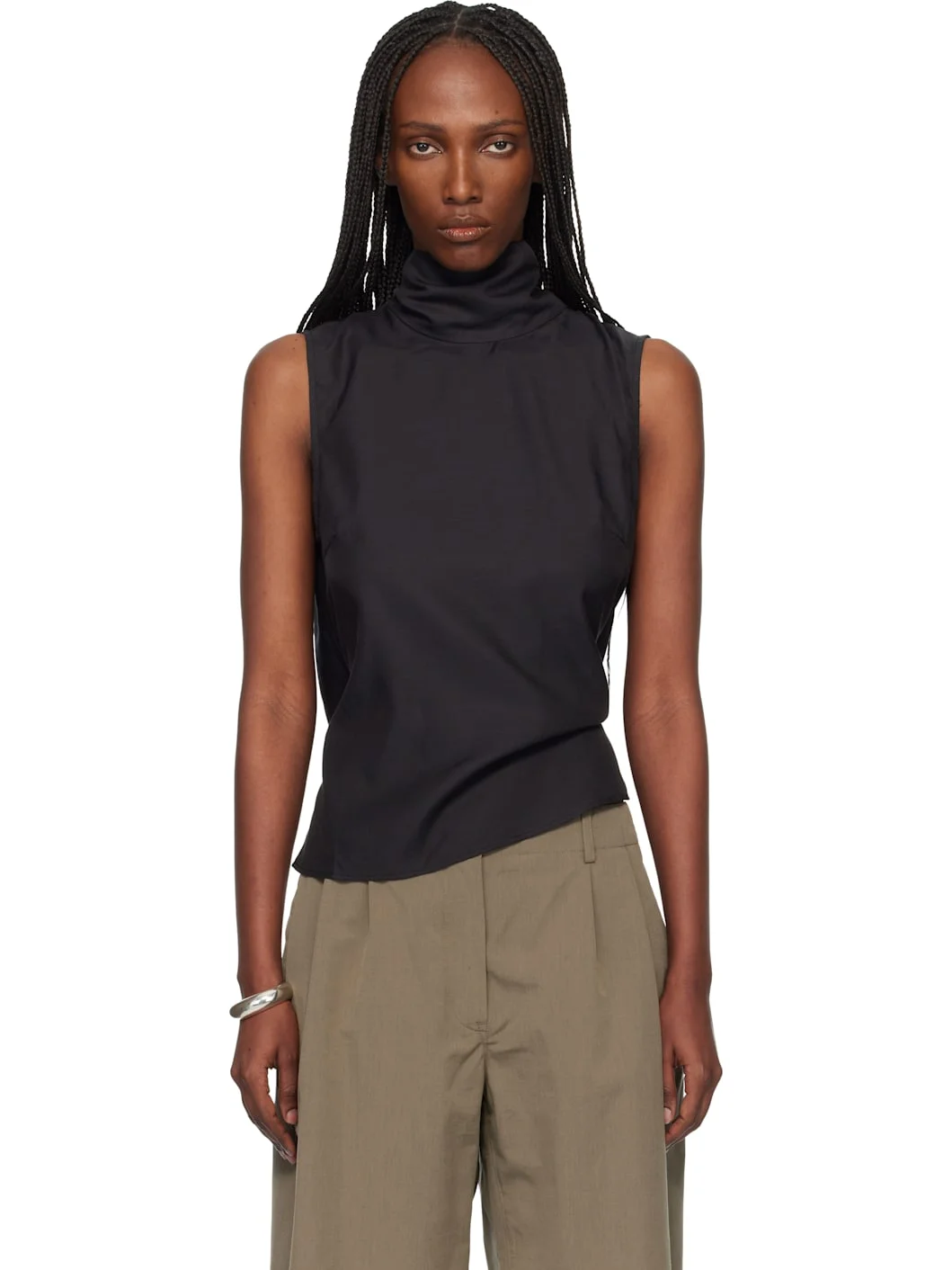 Cupro- and cotton-blend twill blouse. · Integrated self-tie scarf at mock neck · Self-tie fastening at interior · Open back Supplier color: Still Black Calm Cupro Cotton 60% cupro, 40% cotton. Made in Portugal 261803F107001