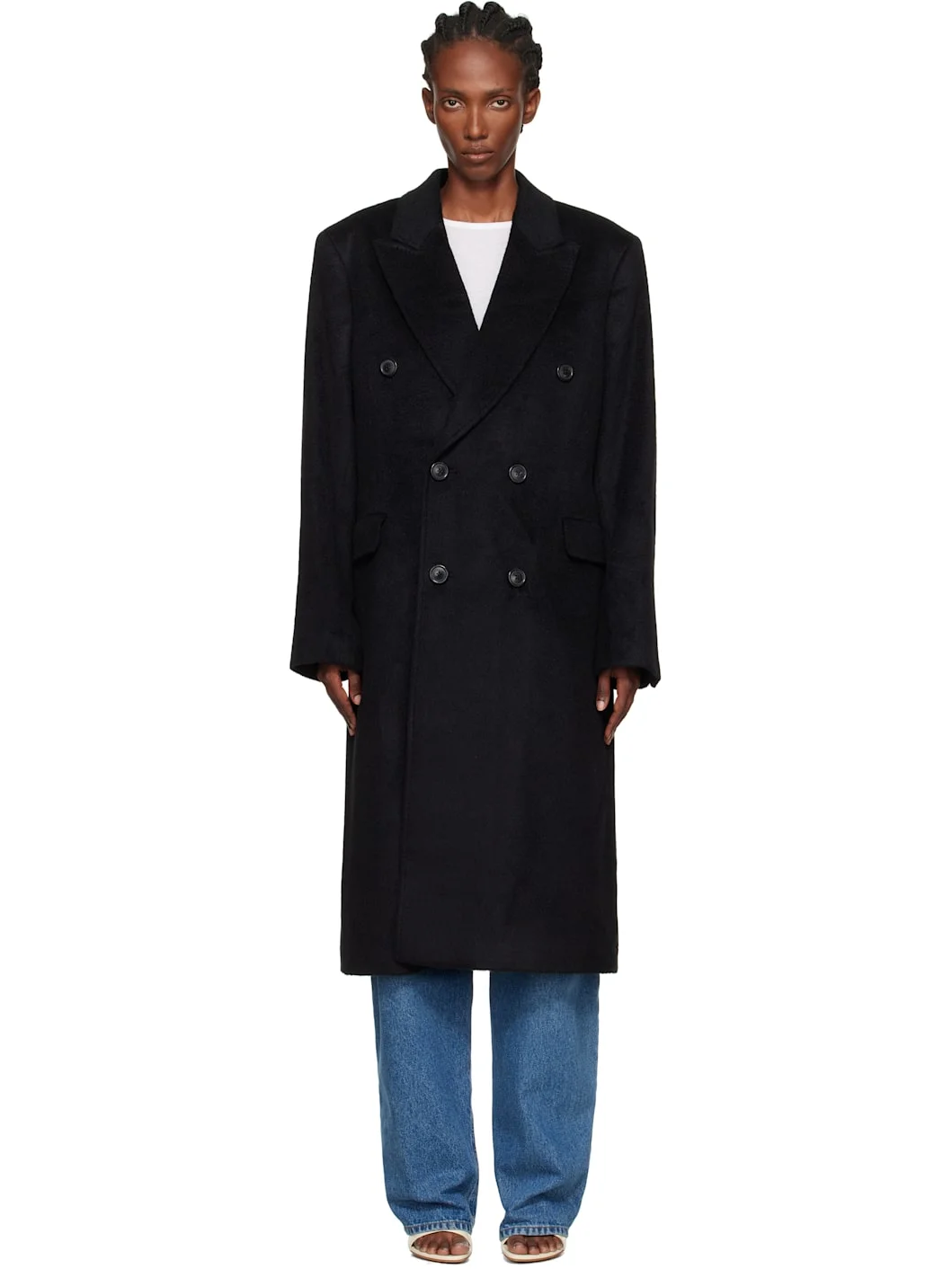 Wool- and mohair-blend melton coat. · Peaked lapel · Double-breasted button closure · Flap pockets at front · Padded shoulders · Surgeon's cuffs · Central vent at back hem · Welt pockets at interior · Full satin lining · Horn hardware Supplier color: Black hair wool Body: 50% wool, 30% mohair, 20% polyamide. Trim: 100% cotton. Lining: 100% viscose. Made in Portugal 252803F059005
