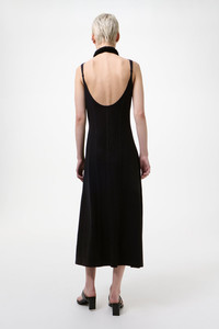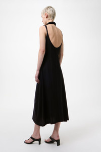 Details · Japanese fabric · 100% Cotton · High twist jersey · Low front and back neckline · Coverstitched darts front and back · Flatlocked center back seam · Back strap detail with loop creating a triangular shape · Fitted chest and waist with A-line drape · W2266BB Description Our Blade Dress in Black High Twist Jersey. Produced in a Japanese cotton high twist jersey, the women's Blade Dress has a fitted chest and waist with an A-line, draping skirt, and features a low front and back neckline, coverstitched darts at the front and back, a flatlocked center back seam, and a back strap detail with a small loop that cinches the straps to create a subtle triangular shape. This garment is manufactured using carefully sourced material with a unique treatment process that will give each garment an individual shade and appearance. This technique could result in some color bleed onto lighter garments or surfaces. The garment shall be shaped by its wearer and naturally distress over time to finish the design process.
