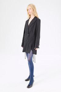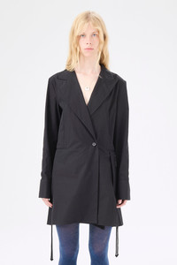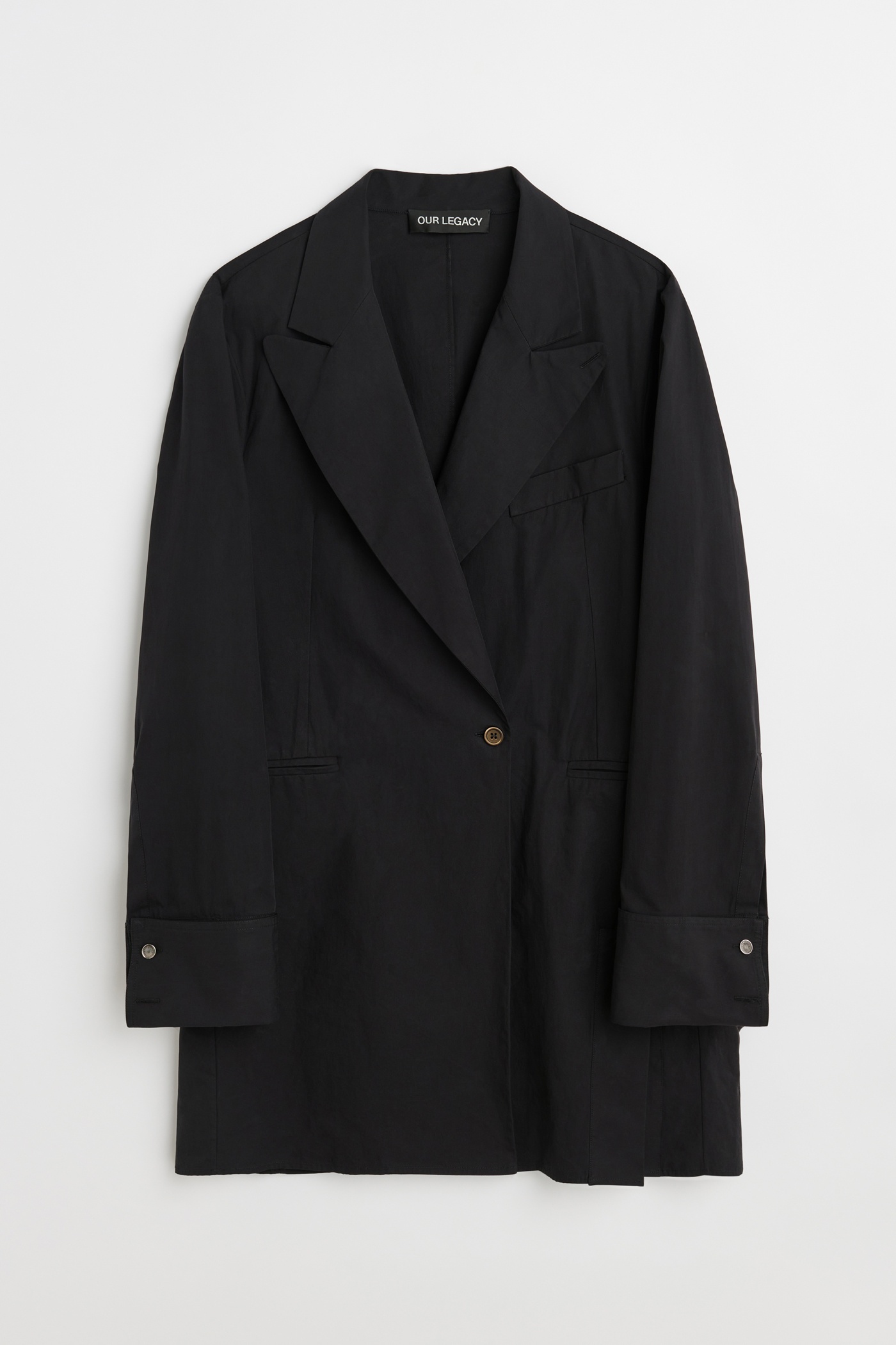 Details · Italian poplin fabric · 100% Cotton · Peaked lapel · Single button closure · Darted for shape · Double cuff with mother of pearl cufflinks · Two welt pockets · Fake chest pocket · Side vent · Slightly curved hem · Relaxed tailored fit · W4242BRB Description Our Blazer Shirt in Ripe Black Poplin. Drawing inspiration from the details and styling of suiting, the Blazer Shirt has a relaxed, unconstructed tailored fit and is produced in an Italian cotton poplin fabric. The Blazer Shirt is darted for shape and features a peaked lapel, a single button closure, two welt pockets, a fake chest pocket and foldable double cuffs with mother of pearl cufflinks.