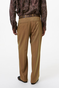 Details · Italian fabric · 100% Virgin Wool · Cangiante effect · OL embroidery · Pleated front · Two side pockets · Two back welt pockets · Corozo buttons · YKK zip fly · Covered hook-and-eye waistband fastening · Wide legged relaxed fit · M2264BBC Description Our Borrowed Chino in Bronze Cangiante Fine Wool. Produced in Italian fine virgin wool with a cangiante effect that subtly shifts between bronze tones, the men's Borrowed Chino has a wide-legged relaxed fit with a pleated front and features a YKK zip fly, a covered hook-and-eye waistband fastening, corozo buttons, two side pockets, two back welt pockets and subtle OL embroidery.