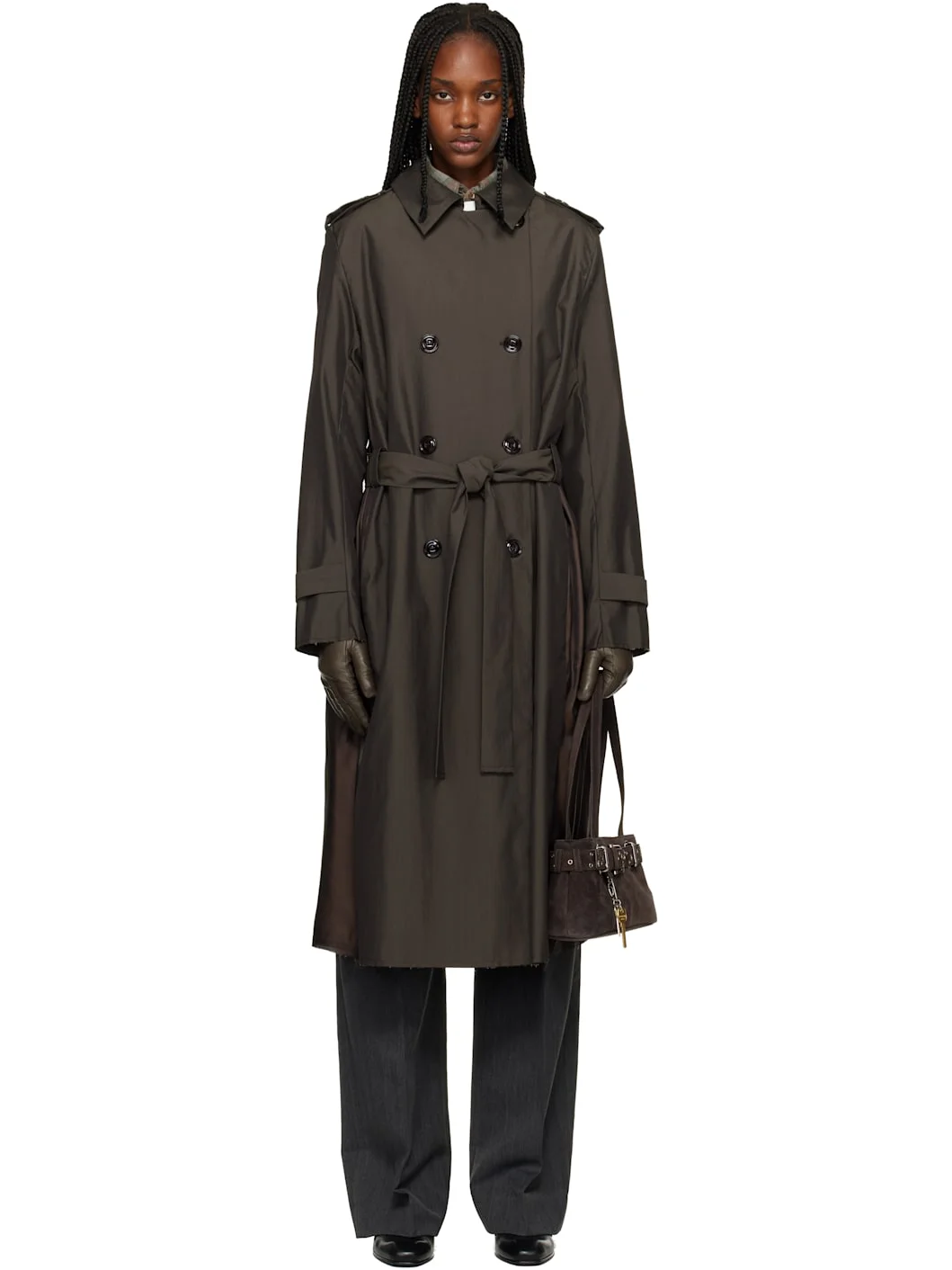 Virgin wool-blend hopsack and satin trench coat. · Spread collar · Double-breasted button closure · Belt loops, self-tie belt, and seam pockets at waist · Raw edge at hem and cuffs · Button epaulets · Adjustable button tab at cuffs · Logo hardware at back collar · Pleats at back yoke · Unlined · Corozo hardware Supplier color: Glazed Brown Durawool Body 1: 75% virgin wool, 25% polyamide. Body 2: 60% acetate, 40% viscose. Made in Bulgaria 261803F067001