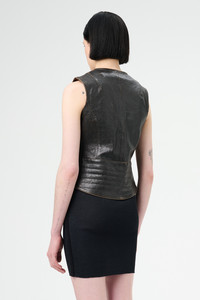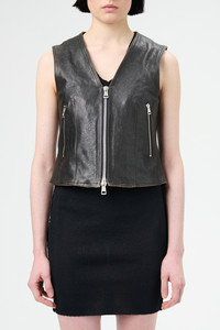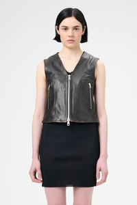 Details · Italian lamb leather · Two way zip · Fully lined · Darted for shape · Two zip pockets · Top stitch detail on tail · Fitted silhouette · W4249RW Description Our Ripley Vest in Worn Brown Lambskin. Produced in an Italian lambs leather, the womens Ripley Vest has a darted silhouette and features a two way zip closure, two zip pockets and a dropped tail with topstitch detailing. This product is crafted from carefully sourced leather. As a natural material, leather carries subtle traces of the animal's life. These natural imperfections bring a unique character to each product, expressing an original and authentic look. The product shall be shaped by its wearer and naturally distress over time to complete the design process.