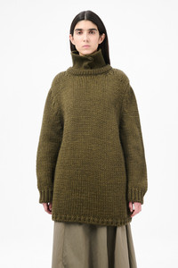 Details · Italian yarn · 70% Wool 30% Alpaca · Heavy knit · 2 ply jersey stitch knit · Ribbed collar with button fastening · Ribbed cuffs and hem · Dropped shoulders · Oversized fit · W4253PO Description Our Polar Popover in Olive Mega Alpaca Wool. Produced in Italian yarn in a wool and alpaca blend, the women's Polar Popover has an oversized fit with dropped shoulders and features a heavy knit 2 ply jersey stitch construction, ribbed collar with button fastening that can be folded up to create a funnel neck, and ribbed cuffs and hem. Bordering on outerwear in weight and warmth, the alpaca blend creates an extremely heavy knit with a dense feeling, achieved through plied yarn that has been washed for enhanced texture and durability.