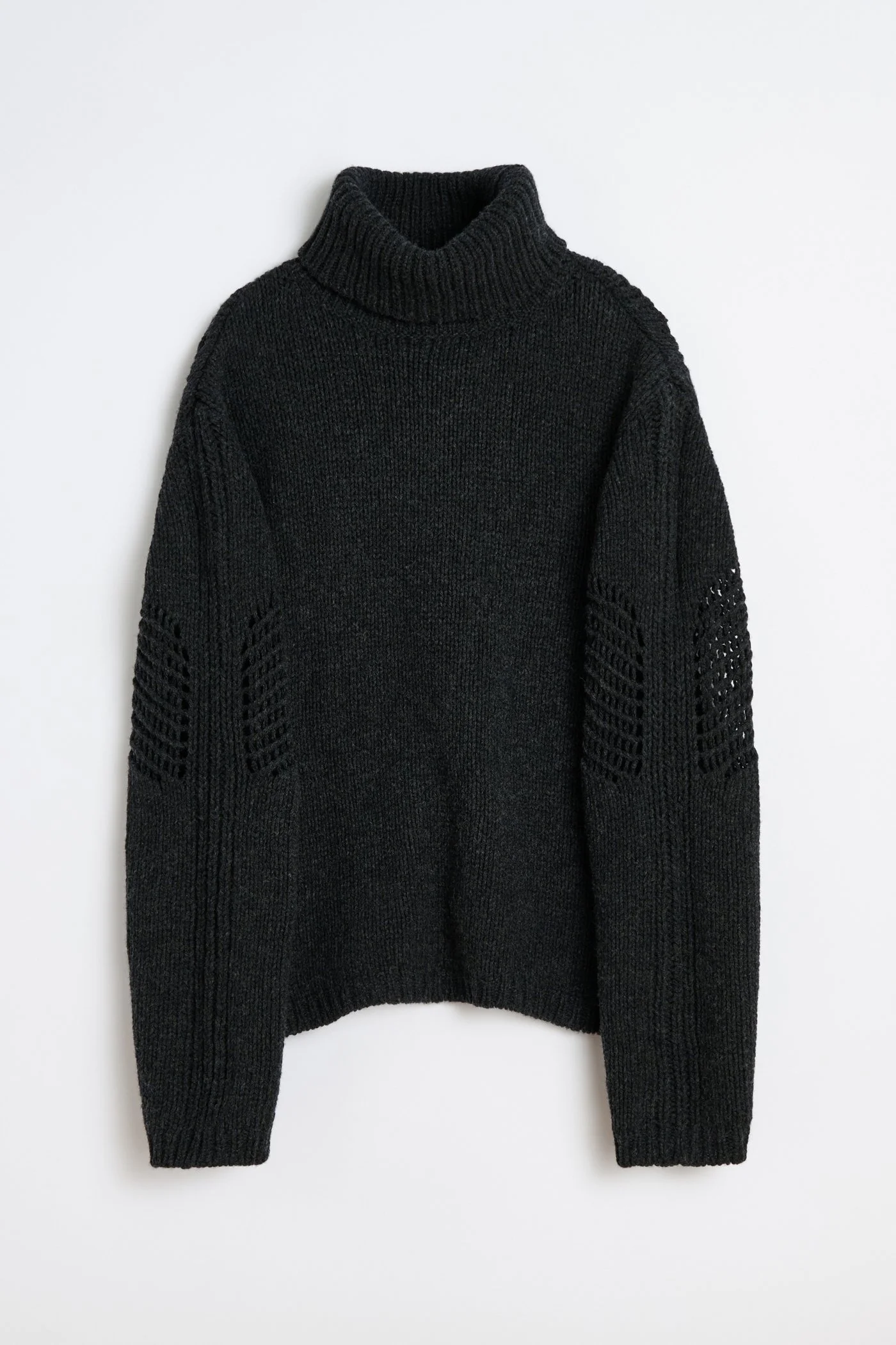 Details · Italian yarn · 100% Extrafine Merino Wool · Ribbed rollneck · Intricate open stitch detail on sleeves and back · Ribbed cuffs and hem · Relaxed, boxy fit · W4253CCL Description Our Cage Rollneck in Charcoal Low Twist Merino. Produced in Italian extrafine merino wool yarn, the women's Cage Rollneck has a relaxed, boxy fit and features a ribbed rollneck collar, intricate open stitch detail on the sleeves and back, and ribbed cuffs and hem. The open stitch design adds visual interest and works beautifully when layered, reimagining the classic winter staple with contemporary detail. This garment is manufactured using a carefully sourced yarn. The natural characteristics of the yarn, combined with the construction of the knit allows the garment to expand when worn. The garment shall be shaped by its wearer and naturally distress over time to finish the design process. To help keep the integrity of the garment please store folded.