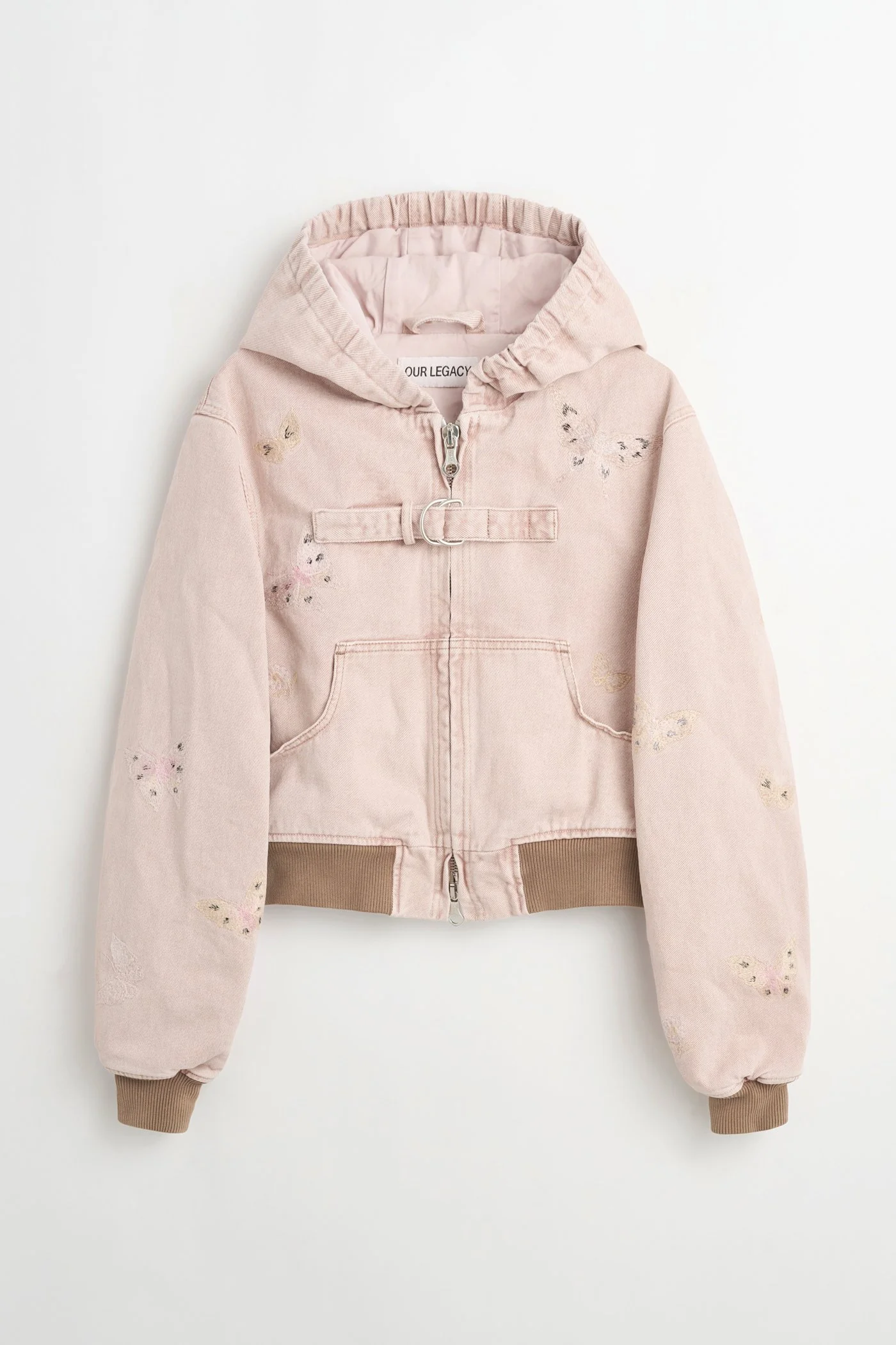 Details · Italian denim · 100% Cotton · Washed finish · Embroidered butterfly motifs · Elasticated hood · Distressed Lampo two-way zip · D-ring buckle strap · Fully lined · Pouch pockets · Ribbed cuffs and hem · Cropped, boxy fit · W2251CRB Description Our Coast Jacket in Rose Butterfly. Produced in a washed Italian denim with embroidered butterfly motifs, the women's Coast Jacket has a cropped, boxy fit and features an elasticated hood, a distressed Lampo two-way zip, an adjustable D-ring buckle strap, pouch pockets and ribbed cuffs and hem. This garment is manufactured using carefully sourced material with a unique treatment process that will give each garment an individual shade and appearance. This technique could result in some color bleed onto lighter garments or surfaces. The garment shall be shaped by its wearer and will naturally distress over time to finish the design process.