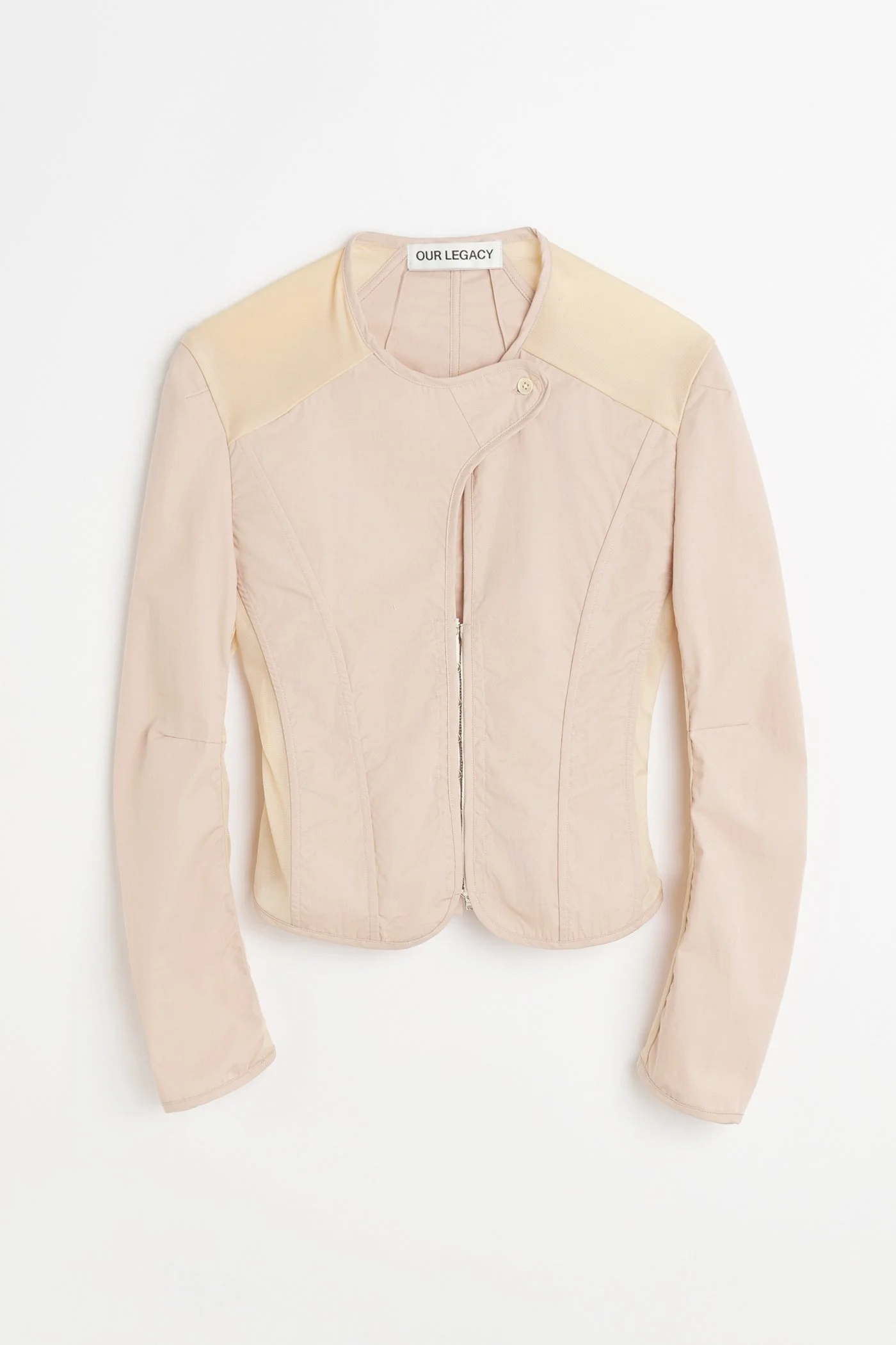 Details · Italian fabric · 100% Cotton · Hook and eye closure · Two way zipped inner layer · Paneled construction · Contrast mesh segments · Button flap at neckline · Darted, cropped fit · W2252CP Description Our Corset Jacket in Powder Rouge Sanded Poplin. Produced in an Italian cotton fabric, the women's Corset Jacket has a darted, cropped fit and features a two way zipped inner layer, a front placket with hook and eye closure, contrasting fabric panels and a flap with button closure. This garment is manufactured using a delicate material with a naturally loose construction. Please handle with care and wash according to washing instructions. Be especially careful with jewelry and other pointed objects that might harm the surface.
