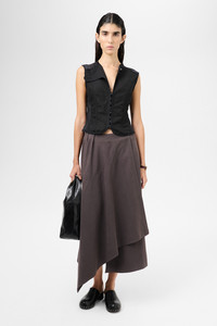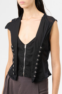 Details · Turkish poplin fabric · 100% Cotton · Hook and eye closure · Two way zipped inner layer · Paneled construction · Contrast mesh segments · Button flap at neckline · Darted, cropped fit · W2252CVB Description Our Corset Vest in Black All Day Poplin. Produced in a Turkish cotton poplin, the women's Corset Vest has a darted, cropped fit and features a two way zipped inner layer, a front placket with hook and eye closure, contrasting fabric panels and a flap with button closure.