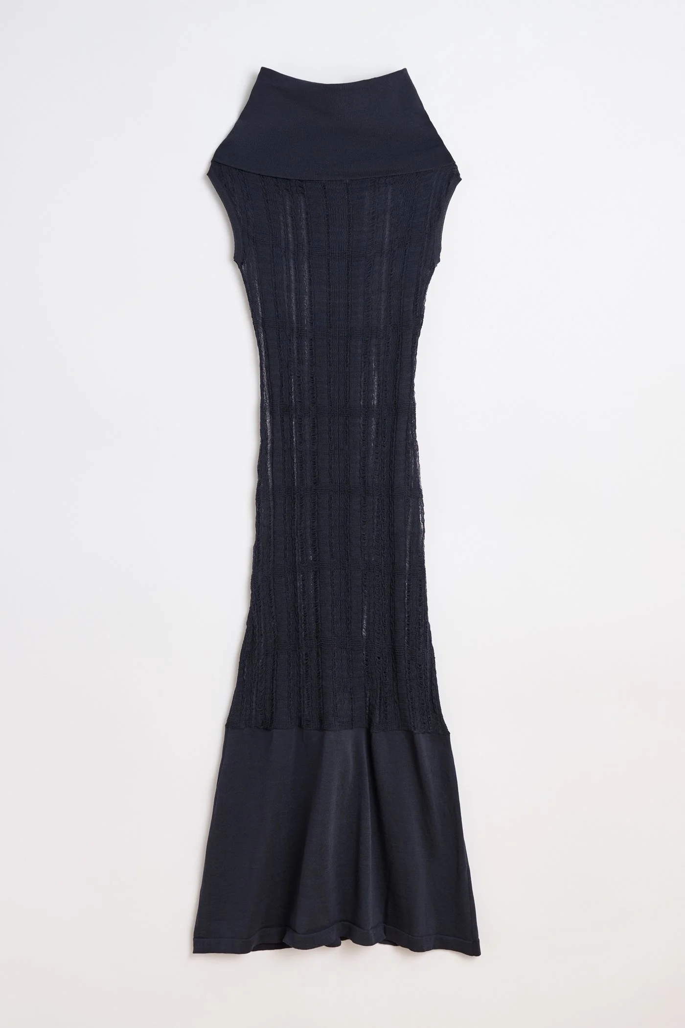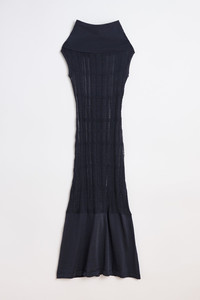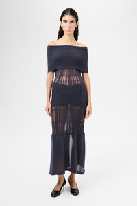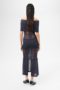 Details · Italian yarn · 78% Organic Cotton 22% Polyamide · Deep ribbed neckline · Textured sheer rib knit body · Body will rouche up and crease when worn · Contrast solid hem · Single back vent · Shaped fit · W2253CWN Description Our Cover Dress in Washed Navy Tech Cotton. Produced in an Italian organic cotton and polyamide blend yarn, the womens shaped Cover Dress has a textured sheer rib knit construction which will rouche up and crease when worn. The Cover Dress features a deep ribbed neckline, a contrast solid hem panel and a single back vent. This garment is manufactured using a delicate material with a naturally loose construction. Please handle with care and wash according to washing instructions. Be especially careful with jewelry and other pointed objects that might harm the surface.