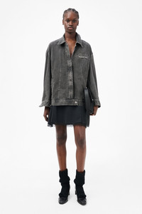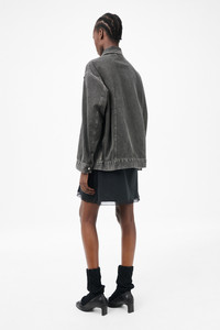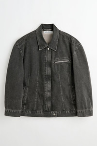 Details · Japanese denim · 100% Cotton · Pigment dyed · Covered placket · Zip closure · Two front welt pockets · Single chest zip pocket · Darted for shape · Dropped shoulders · Button cuffs · Relaxed, slightly oversized fit · W225DJB Description Our Draft Jacket in Black Coated Wash. Produced in a washed Japanese pigment dyed denim, the women's darted Draft Jacket has a slightly oversized, relaxed straight fit, and features a covered placket, a zip closure and two welt front pockets. This garment is manufactured using carefully sourced material with a unique treatment process that will give each garment an individual shade and appearance. This technique could result in some color bleed onto lighter garments or surfaces. The garment shall be shaped by its wearer and naturally distress over time to finish the design process.