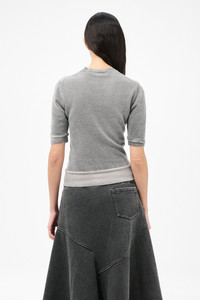 Details · Italian yarn · 100% Merino Wool · Refined soft yarn · Custom cold spray dye finish · Topstitch hem finish · Rolling edge detail · Raw feeling construction · Cropped, shaped fit · W4253DGS Description Our Dual Tee in Grey Spray Dye Cherub Wool. Produced in refined soft merino wool, the women's Dual Tee has a tight, shaped fit with a short body and features a custom cold spray dye treatment that picks up the surface of the yarn and highlights the details. The hems are finished with topstitching and rolling edges for a raw feeling. This garment is manufactured using carefully sourced material with a unique treatment process that will give each garment an individual shade and appearance. This technique could result in some color bleed onto lighter garments or surfaces. The garment shall be shaped by its wearer and naturally distress over time to finish the design process.