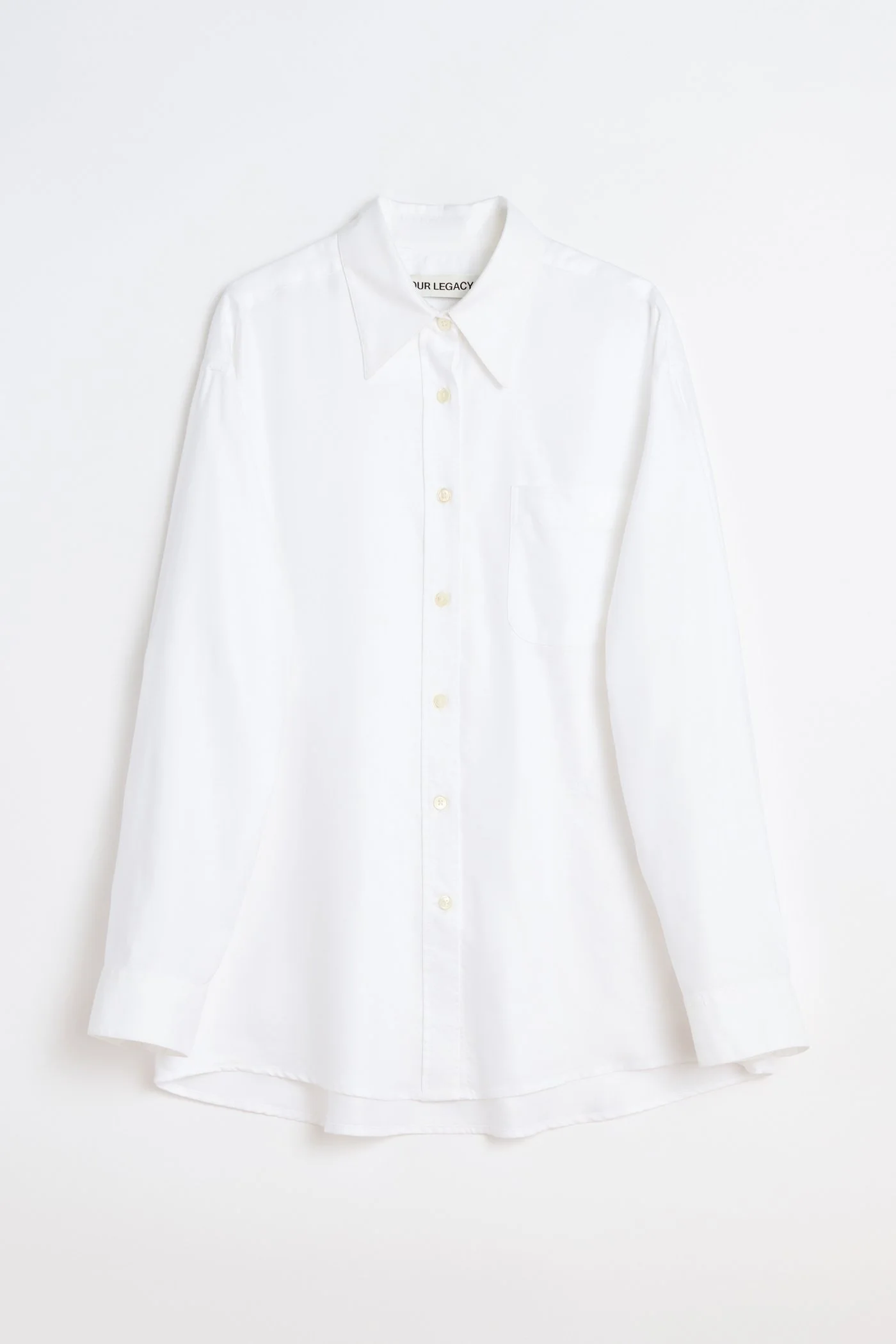 Details · Portuguese fabric · 100% Tencel · Mother of pearl buttons · Single chest patch pocket · Curved hem · Mitered cuffs · Wrap side seams · Relaxed, slightly shaped fit · W4252PS Description Our Precious Shirt in Static White Liquid Oxford. Produced in Portuguese tencel fabric, the women's Precious Shirt has a relaxed, slightly shaped fit and features mother of pearl buttons, a single chest patch pocket, curved hem, darts in the back for shape, mitered cuffs and wrap side seams.