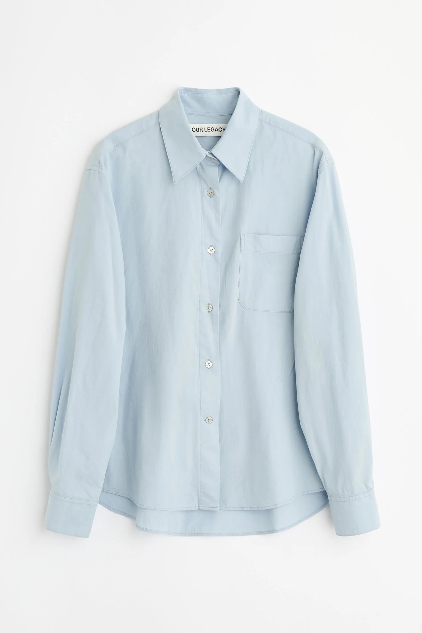 Details · Chinese fabric · 60% Lyocell 40% Cotton · Grown on placket · Back box pleat · Mother of pearl buttons · Rounded corner patch chest pocket · Curved hem · OL logo embroidery at front left side · Regular fit · W2262PB Description Our Forever Shirt in Powder Blue Liquid Poplin. Produced in Chinese lyocell and cotton fabric, the men's Forever Shirt has a classic, regular fit with a flattering length that finishes around the hip and features a grown on placket, back box pleat, rounded corner patch chest pocket, mother of pearl buttons, a curved hem with the back slightly longer than front, and OL logo embroidery at the front left side.