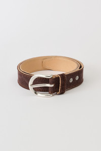 Details · Italian leather · Denim top layer · Natural pigment dyed · Metal pin buckle closure · Single keeper · 30mm wide · Edges will fray upon wearing · Dust bag · A2268FM Description Our Fringed Denim Belt in Overdyed Choco Melon. Produced in Italian leather with a denim top layer and natural pigment dyeing, this belt features a metal pin buckle closure, single keeper and measures 30mm wide. Please note the edges of the belt will fray upon wearing. This product is crafted from carefully sourced leather. As a natural material, leather carries subtle traces of the animal's life. These natural imperfections bring a unique character to each product, expressing an original and authentic look. The product shall be shaped by its wearer and naturally distress over time to complete the design process.