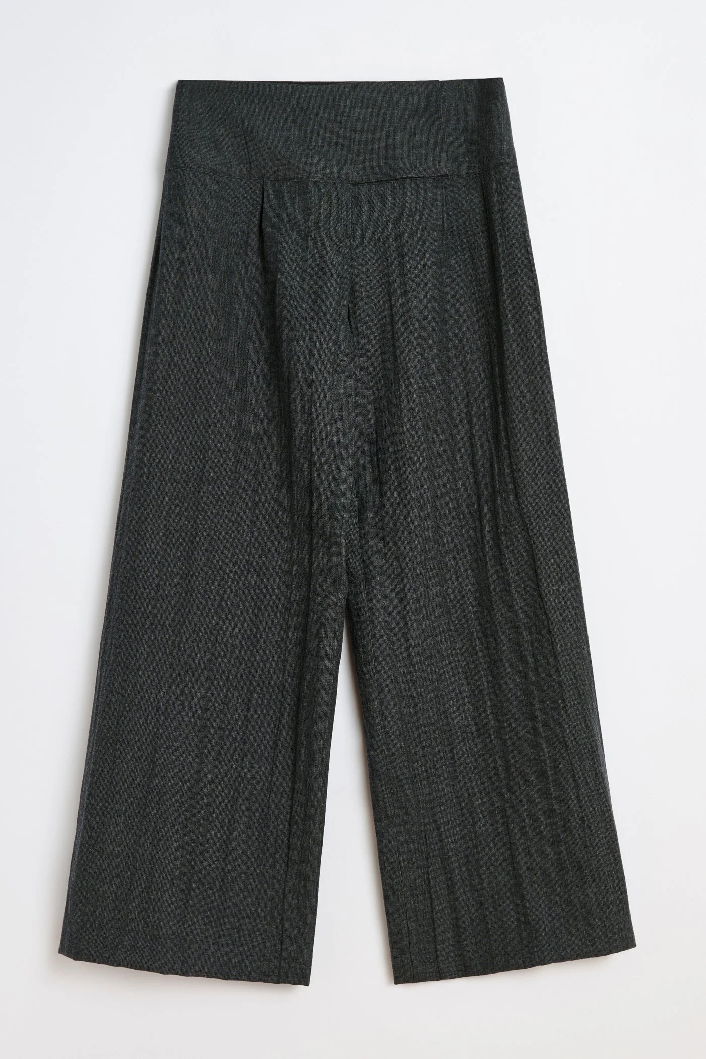 Details · Italian fabric · 88% Virgin Wool 12% Polyamide · Plisse treatment · Wide waistband with snap closure · Pleated front · No side seam · Fully lined · YKK zip fly · Relaxed, wide fit · W4254GSG Description Our Girdle Trouser in Stone Grey Plisse Wool. Produced in Italian fabric with virgin wool and polyamide, the women's Girdle Trouser has a relaxed, wide fit and features a plisse treatment creating a permanent crinkled and pleated effect, a wide waistband with snap closure extension, front pleats, no side seams, and a YKK zip fly. Inspired by vintage suits featuring girdle belts, the voluminous silhouette sits at a low waist level and features no pockets. This garment is crafted from a carefully selected fabric featuring a plisse treatment, chosen for its unique texture and character. This specialized technique creates a permanent crinkled and pleated effect, giving the material a distinctive three-dimensional quality and dynamic visual appeal.