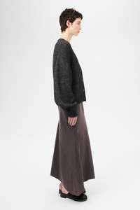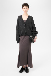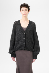 Details · Italian yarn · 60% Alpaca 40% Lana Wool · V neck collar · Ribbed placket · Mother of pearl buttons · Ribbed cuffs and hem · Dropped shoulders · Relaxed fit · W4243AP Description Our Academy Cardigan in Pepe Nero Airy Alpaca. Produced in a Italian alpaca and wool blend yarn, the womens Academy Cardigan has a relaxed, straight fit and features dropped shoulders, a v-neck collar, a ribbed placket, mother of pearl buttons and ribbed cuffs and hem. This garment is manufactured using a carefully sourced yarn. The natural characteristics of the yarn, combined with the construction of the knit allows the garment to expand when worn. The garment shall be shaped by its wearer and naturally distress over time to finish the design process. To help keep the integrity of the garment please store the garment folded.