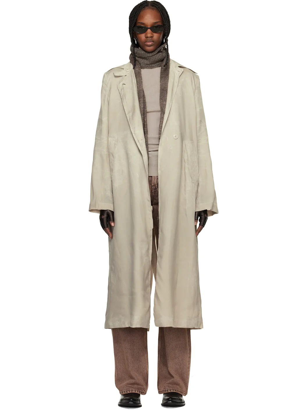 Waxed cupro twill coat. · Water-repellent · Fading throughout · Spread collar · Button closure · Welt pockets at front · Logo hardware at back collar · Corozo hardware Supplier color: Ghost grey wax dipped cupro 100% cupro. Made in Portugal 261803F067002