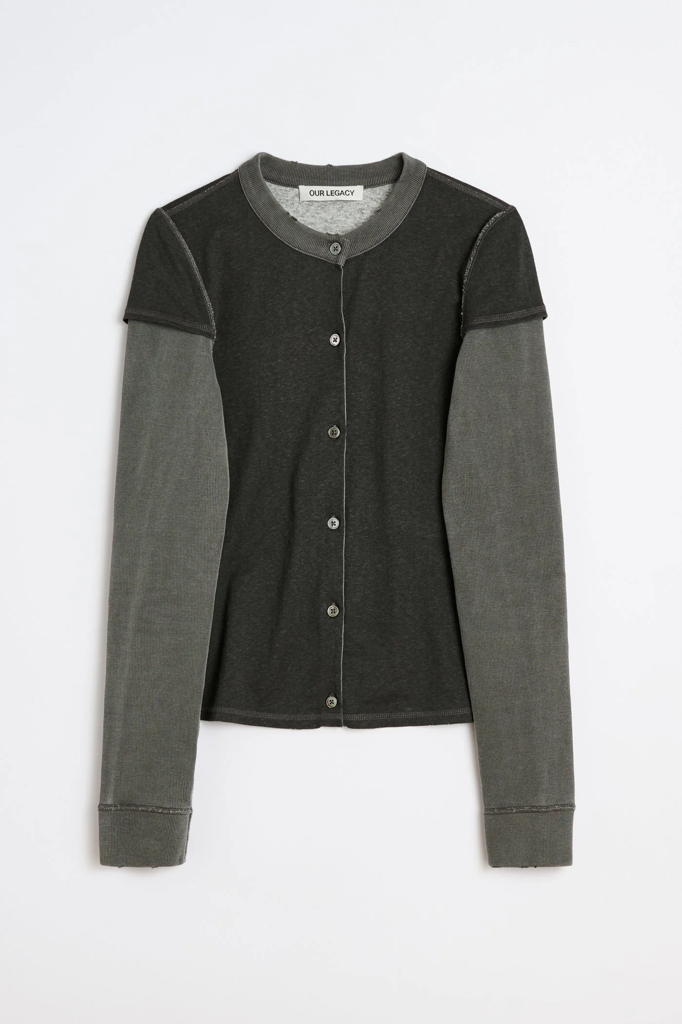 Details · Portuguese jersey · 100% Cotton · Pigment printed · Layered construction · Distressed details · Mop buttons · Ribbed collar and cuffs · Straight hem · Slim fit · W4256HF Description Our Heat Longsleeve in Black 1000 Points Print. Produced in Portuguese jersey cotton, the women's Heat Longsleeve has a slim fit and features a unique layered construction with double sleeves that creates the illusion of wearing a short sleeve cardigan over a longsleeve top. The style includes mop buttons, distressed details, a clean button placket, ribbed collar and cuffs, and a straight hem. This garment is manufactured using a unique treatment process where the colour is printed onto the material, leaving the reverse side raw. This will give each garment an individual appearance. This technique could result in some color bleed onto lighter garments or surfaces. The garment shall be shaped by its wearer and naturally distress over time to finish the design process.