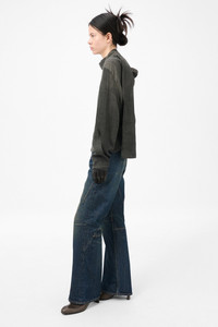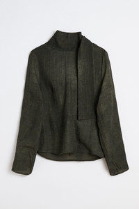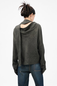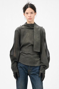 Details · Italian fabric · 90% Cotton 10% Wool · Elegant draping silhouette · Long collar panel · Can be tied as Lavalliere or wrapped as scarf · Open back design with internal waist ties · Long draping sleeves with slits · Adjustable fit at waist · W4252VD Description Our Virtuous Blouse in Dark Cloud Sparse Cotton Wool. Produced in a Italian cotton wool blend fabric, the women's Virtuous Blouse has an elegant draping style with distinctive details and features a long collar panel that can be tied as a Lavalliere or wrapped around the neck as a scarf, a draping silhouette that exposes the back, internal ties that can be used to cinch the waist for a tailored fit, and long draping sleeves constructed with slits.