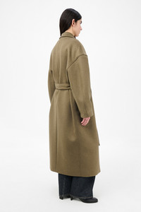 Details · Italian melton fabric · 75% Wool 25% Polyamide · Dropped shoulders · Hidden placket buttoning · Corozo buttons · Two welt pockets · Fully lined · Wrap around construction · Waist belt · Oversized fit · W4251CD Description Our Court Coat in Disruptive Moss Kilo Melton. Produced in Italian melton fabric combining wool and polyamide, the women's Court Coat has an oversized fit and features dropped shoulders, a hidden placket with corozo buttons, wrap-around construction with waist belt, two welt pockets, and is fully lined for comfort and warmth.