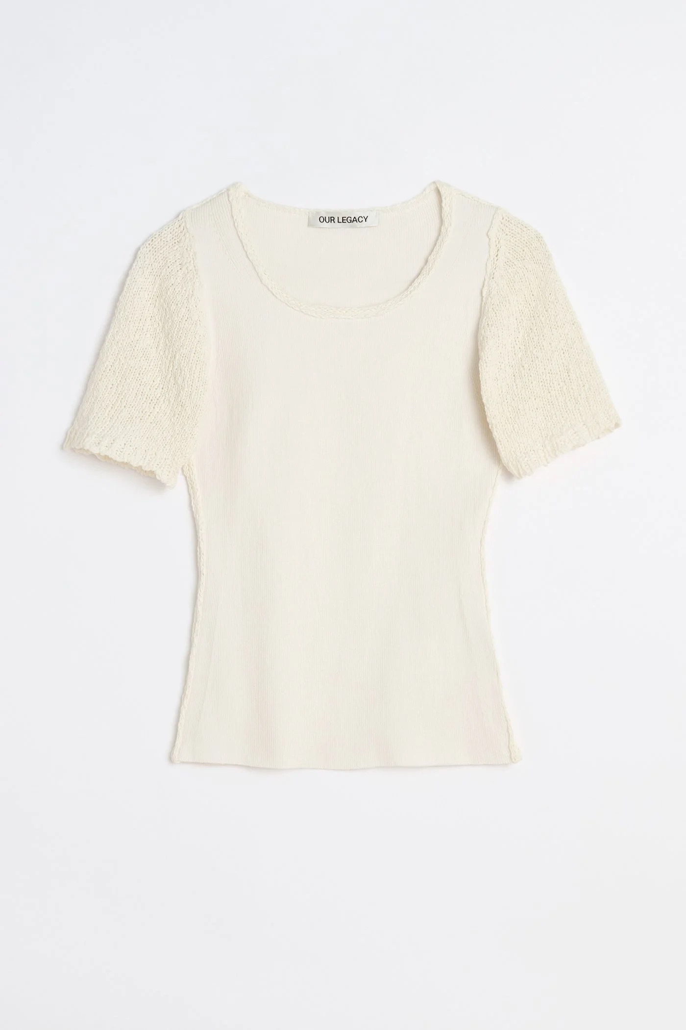 Details · Italian yarn · 78% Organic Cotton 22% Polyamide · 2x2 rib knit body · Contrast jersey knit collar and sleeves · Knit taped shoulder and side seams · Slim, straight fit · W2253IB Description Our Inverse Roundneck Shortsleeve in Bone Tech Cotton. Produced in an Italian cotton and nylon blend yarn, the womens Inverse Roundneck Shortsleeve has a slim, straight fit and features a 2x2 rib knit body, contrast jersey knit collar & sleeves, ribbed cuffs, and knit taped shoulder and side seams.