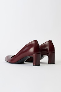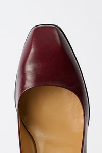 Details · Italian leather · Vegetable tanned · 5 cm block heel · Pointed toe with angular shape · Thin leather sole · Leather covered block heel · Fitted last with pointier toe · Wide opening design · A4257KT Description Our Karasu Pump in True Dyed Lovers Red Leather. Crafted from Italian calf leather with vegetable tanning, this pump features a distinctive angular toe shape with a beak-like front that defines the Karasu family aesthetic. The pump stands on a thin leather sole with a 5cm leather-covered block heel that widens towards the front for a refined silhouette. The fitted last creates a blunted winklepicker design with a wide opening, combining elegance with Our Legacy's signature contemporary edge. This product is crafted from carefully sourced leather. As a natural material, leather carries subtle traces of the animal's life. These natural imperfections bring a unique character to each product, expressing an original and authentic look. The product shall be shaped by its wearer and naturally distress over time to complete the design process.