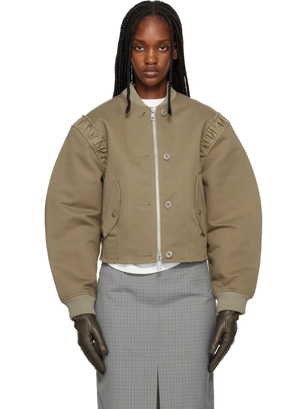 Cotton sateen bomber jacket. · Rib-knit stand collar and cuffs · Loops at collar · Two-way zip closure · Alternate button closure · Press-stud flap pockets at waist · Darts at cropped hem · Ruffles at armscyes · Full twill and satin lining Supplier color: Kharkee Double Weave Sateen Body: 100% cotton. Lining: 51% viscose, 49% cotton. Made in Portugal 261803F058001