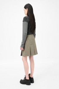 Details · Japanese fabric · 70% Cotton 30% Nylon · Iridescent solaro effect · Wide girdle belt waistband · Sew-on snap closure · A-line silhouette · Wide pleat design · W4254GS Description Our Girdle Skirt in Solaro Sage Tide Cotton Nylon. Produced in a cotton and nylon blend fabric with an iridescent solaro effect, the women's Girdle Skirt features a wide girdle belt waistband that fastens with sew-on snaps. The A-line silhouette showcases a wide pleat design and can open fully to function as a sarong, offering versatile styling options.