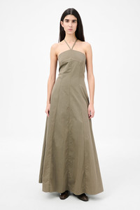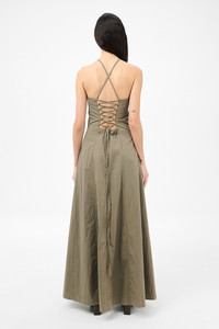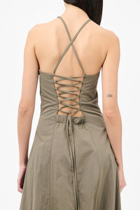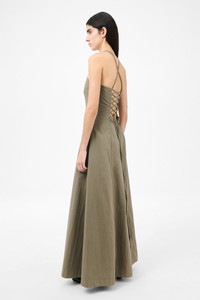 Details · Italian fabric · 70% Cotton 30% Nylon · Iridescent solaro effect · Front panel detail · Concealed side zip · Thin cross over straps · Lace corset detail at back · A-line silhouette · Full length · W4257PS Description Our Poise Dress in Solaro Sage Tide Cotton Nylon. Produced in Italian cotton nylon fabric with an iridescent solaro effect, the women's Poise Dress is inspired by vintage ballroom gowns and has a fitted silhouette at the chest and waist with a wide A-line skirt. The full-length dress features thin crossover straps at the back, a front panel detail, concealed side zip, and lace corset detail at the back with an elasticated panel for adjustability.