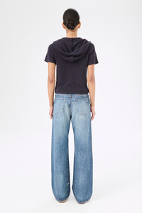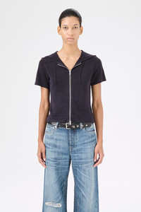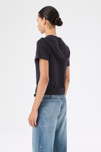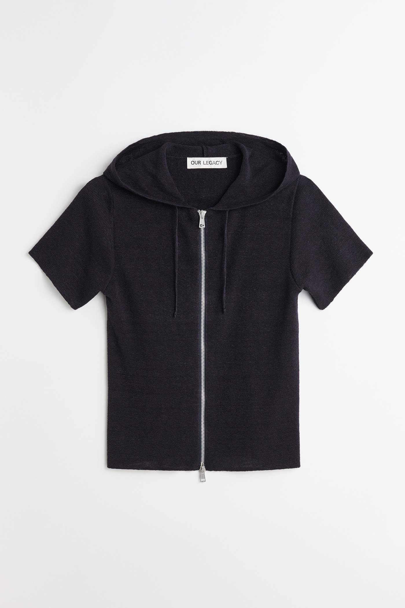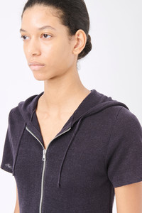 Details · Italian yarn · 100% Linen · Fine knit · Drawstring hood · Short sleeved · Zip closure · Slim, form fitting silhouette · W2243KW Description Our Knitted Slim Hood in Wisconsin Refined Linen. Produced in an Italian linen yarn, the Knitted Slim Hood has a slim, form fitting silhouette and features a short sleeves, a drawstring hood and a front zip closure. This garment is manufactured using a carefully sourced yarn. The natural characteristics of the yarn, combined with the construction of the knit allows the garment to expand when worn. The garment shall be shaped by its wearer and naturally distress over time to finish the design process. To help keep the integrity of the garment please store the garment folded.