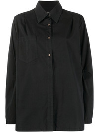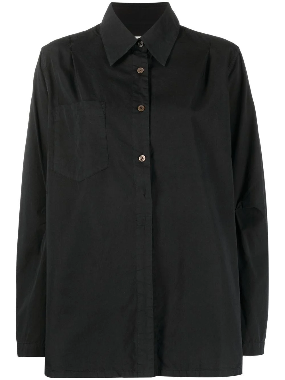 oversized long-sleeve shirt black cotton blend classic collar front button fastening front patch pocket long sleeves straight hem Imported Composition Cotton 66%, Cupro 34% SIZE & FIT Model measurements Height 5 ft 10 in(1.79 m) Bust/Chest 33.07 in(84 cm) Hips 35.82 in(91 cm) Waist 24.01 in(61 cm) FittingInformation This piece fits true to size. We recommend you get your regular size Cut for a loose fit Made with a mid-weight non-stretch fabric Washing instructions Machine Wash