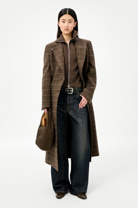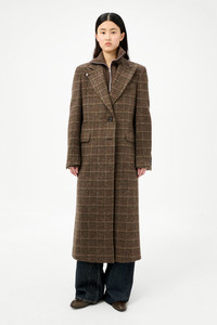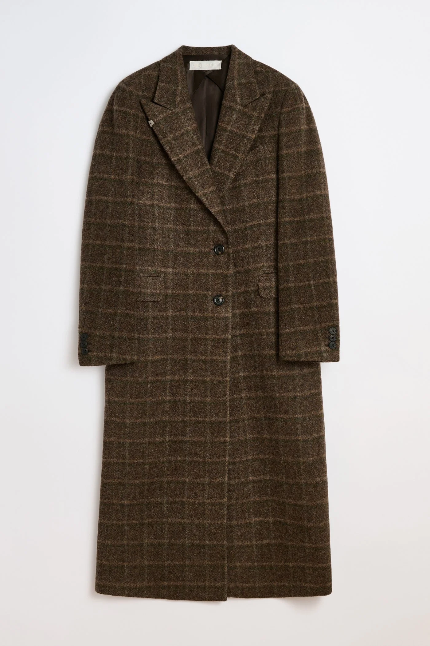 Details · Italian fabric · 100% Virgin Wool · Checkered pattern · Single-breasted · Contrast topstitching · Elongated peak lapel · Horn buttons · Slight wrap in fastening · Fully lined · Hook and bar closure at lapel · Flapped jet pockets · Single back vent · Oversized, longer fit · W4251MD Description Our Manta Coat in Dorf Check Boiled Alp Wool. Crafted from premium Italian virgin wool fabric featuring a distinguished checkered pattern. This oversized, longer-fit coat showcases elegant contrast topstitching, an elongated peak lapel, and sophisticated horn buttons. The single-breasted design includes a slight wrap in fastening with a hook and bar closure at the lapel. Fully lined for comfort and warmth, the coat is complemented by practical flapped jet pockets and a single back vent that enhances movement and drape.